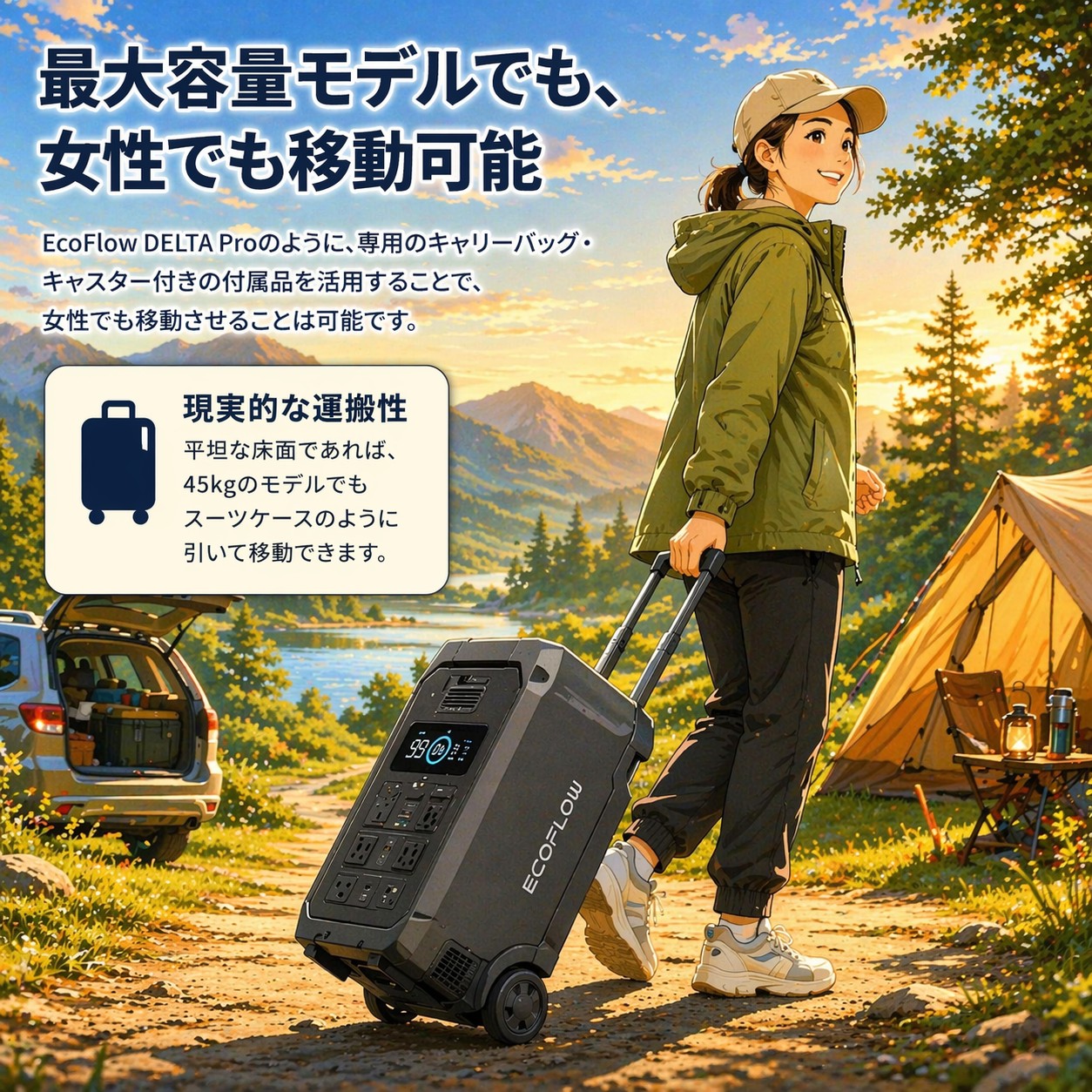EcoFlow DELTA Proのように、専用のキャリーバッグ・キャスター付きの付属品を活用することで、女性でも移動させることは可能です。